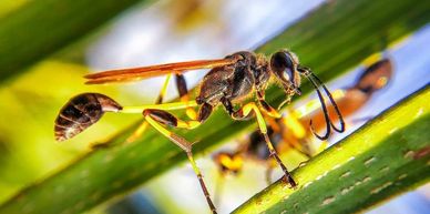 These solitary wasps aren’t aggressive, but they can be alarming. They build mud tubes around eaves and cracks, where they trap spiders to feed their larvae.